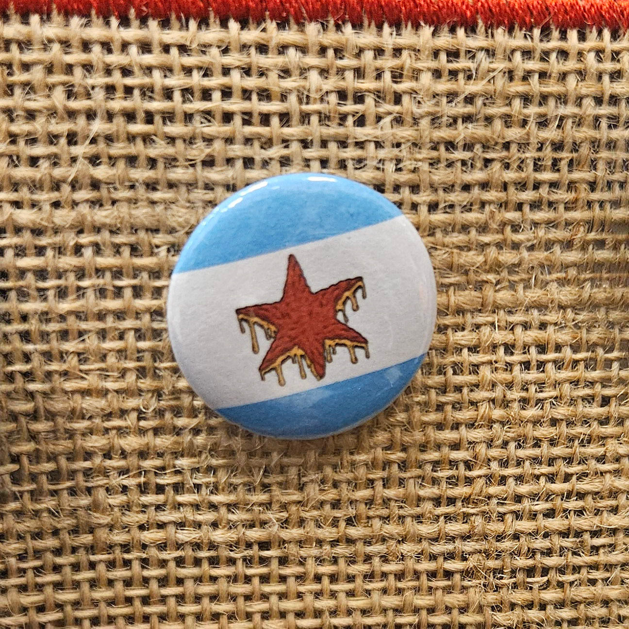 This 1" button pin features a Chicago star made from deep dish pizza, paired with classic blue bars—a playful tribute to the city’s most iconic food and unmistakable flag design. Bold, cheeky, and undeniably Chicago, it’s the perfect finishing touch for jackets, bags, hats, or lanyards.A small accessory with big local flavor.