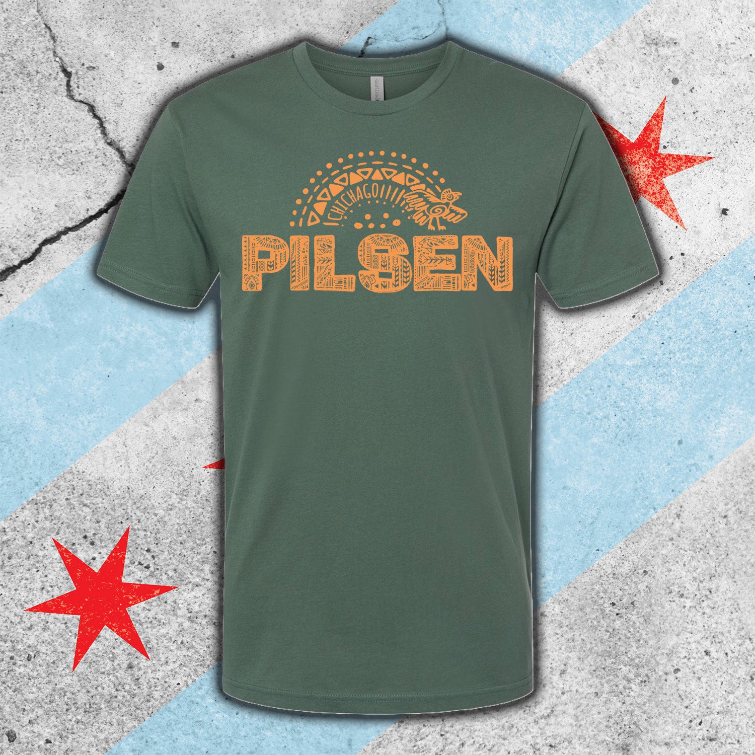 Inspired by the rich history, art, and energy of the Pilsen neighborhood, this tee features an Aztec-style sun paired with textured Pilsen lettering and subtle Chicago details woven throughout the design. It’s a tribute to the neighborhood’s deep roots, vibrant murals, and creative spirit.Printed on a soft, everyday tee, this piece is made for street festivals, gallery hopping, and showing love for one of Chicago’s most iconic neighborhoods.